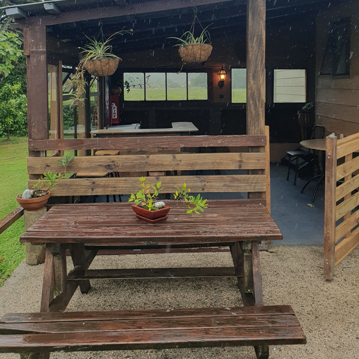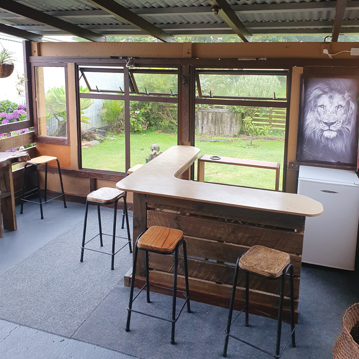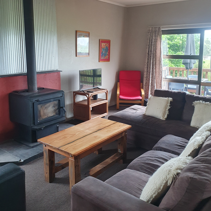 Fully functioning kitchen, dining room and lounge with woodburner, TV and WiFi. It has a large deck on the western end and a large covered bar area on the east.